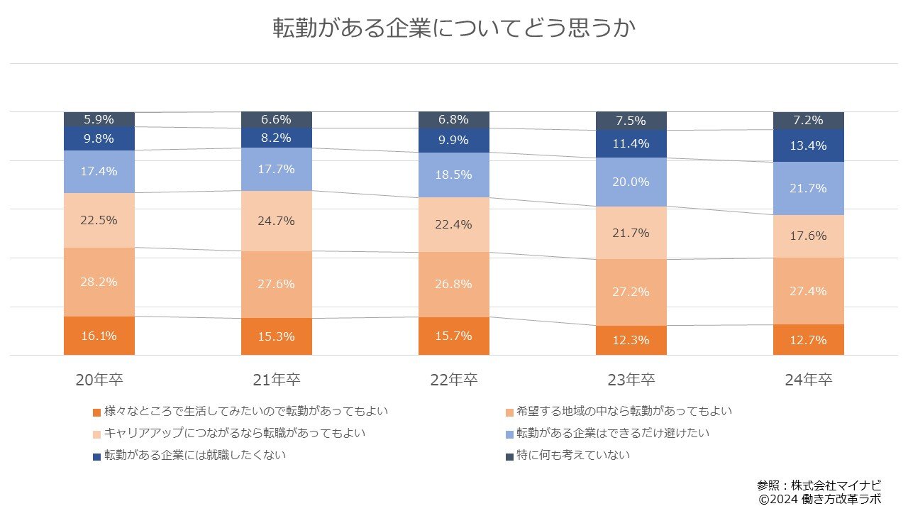 2023年4月にマイナビが発表した『転勤がある企業に「就職したくない」割合は?』の調査結果によると、転勤がある企業に「就職したくない」と答えた2024年卒の学生は13.4%、「できるだけ避けたい」と答えた学生は21.7%になり、合計35.1%と3年連続で増加しました。