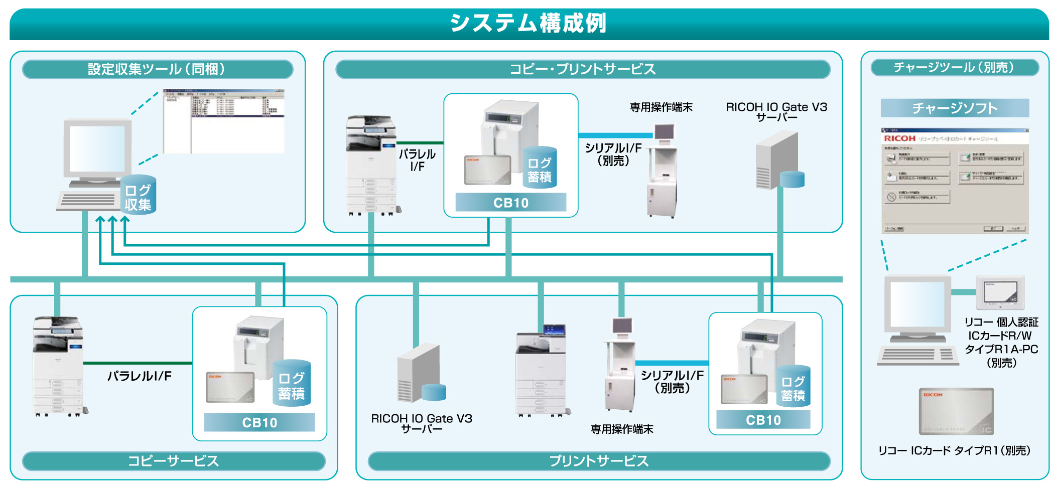 「リコープリペイドICカード チャージツール」(カード発行チャージソフト、管理者カード2枚)で、標準ICカード「リコーICカードタイプR1」の新規発行・照会・変更・チャージ・利用ロック解除が行なえます。