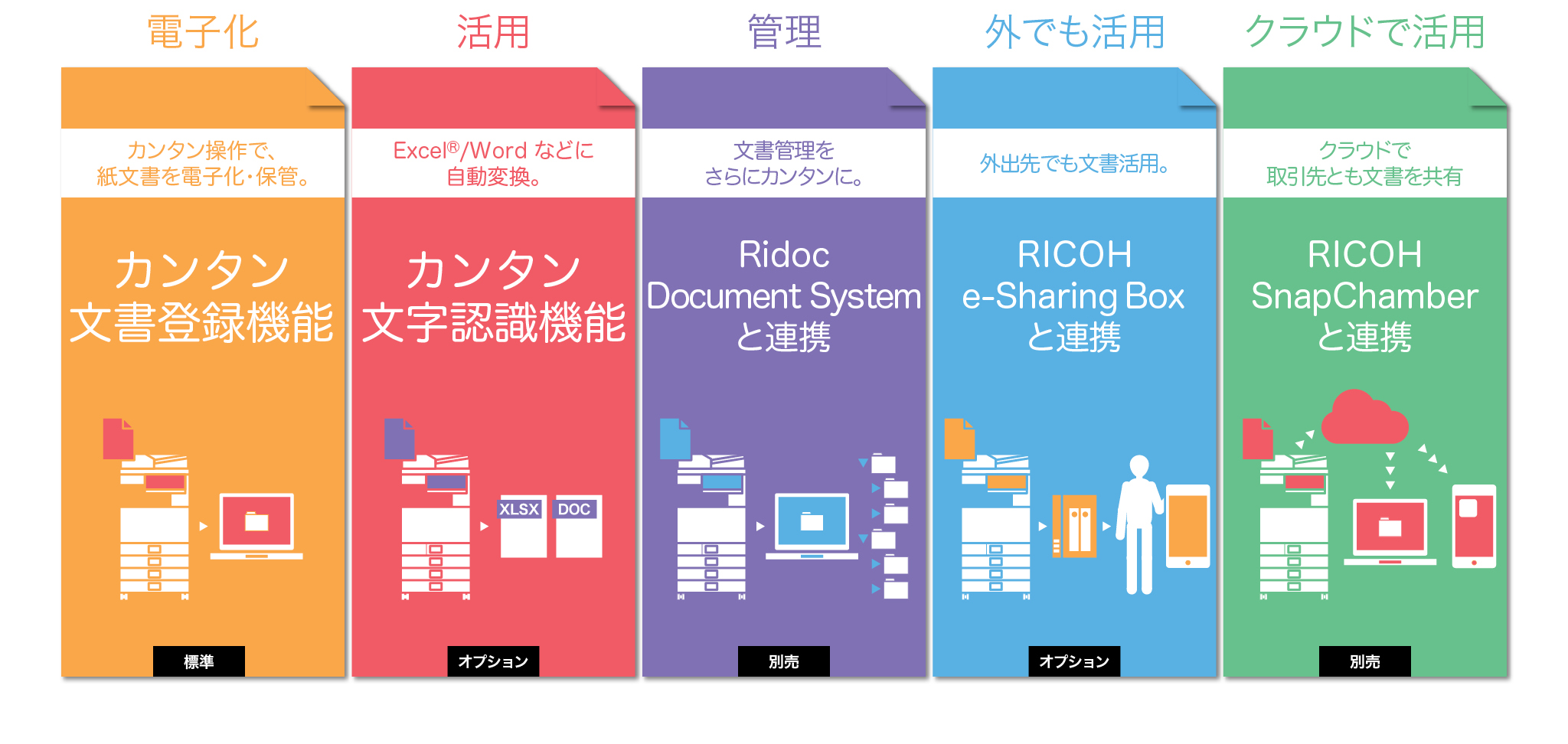 紙文書の電子化から、データ管理・活用まで。複合機のタッチパネルで思いのままに。
