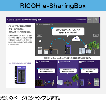 「RICOH e-Sharing Box」と連携すれば、複合機のタッチパネルを操作することで、