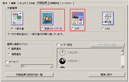 カラー機用RPCSドライバーで印刷品質タブの文書種類で写真(イメージデータ)もしくはDTPを選択した場合、