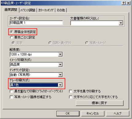 | (2) | [グレー画素のみ黒一色]を選択したときは、[印刷品質・ユーザー設定]ダイアログの[バランス調整]タブにある[明度]、[コントラスト]、[彩度]、[カラーバランス]は調整しないでください。 また[カラーマッチング]タブにある[カラーマッチング]は「しない」を選択してください。 |