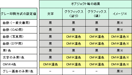 | (1) | [印刷品質]タブ-[その他]タブで、[イメージデータに変換して印刷する]にチェックしている場合、グレー印刷方式の設定に関わらず、黒とグレーはCMYK混色で印刷されます。 |