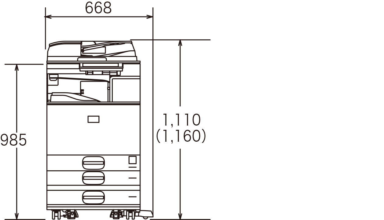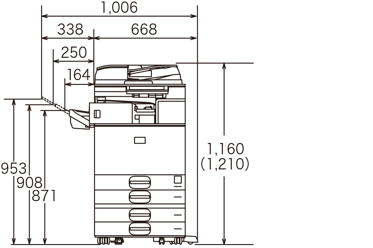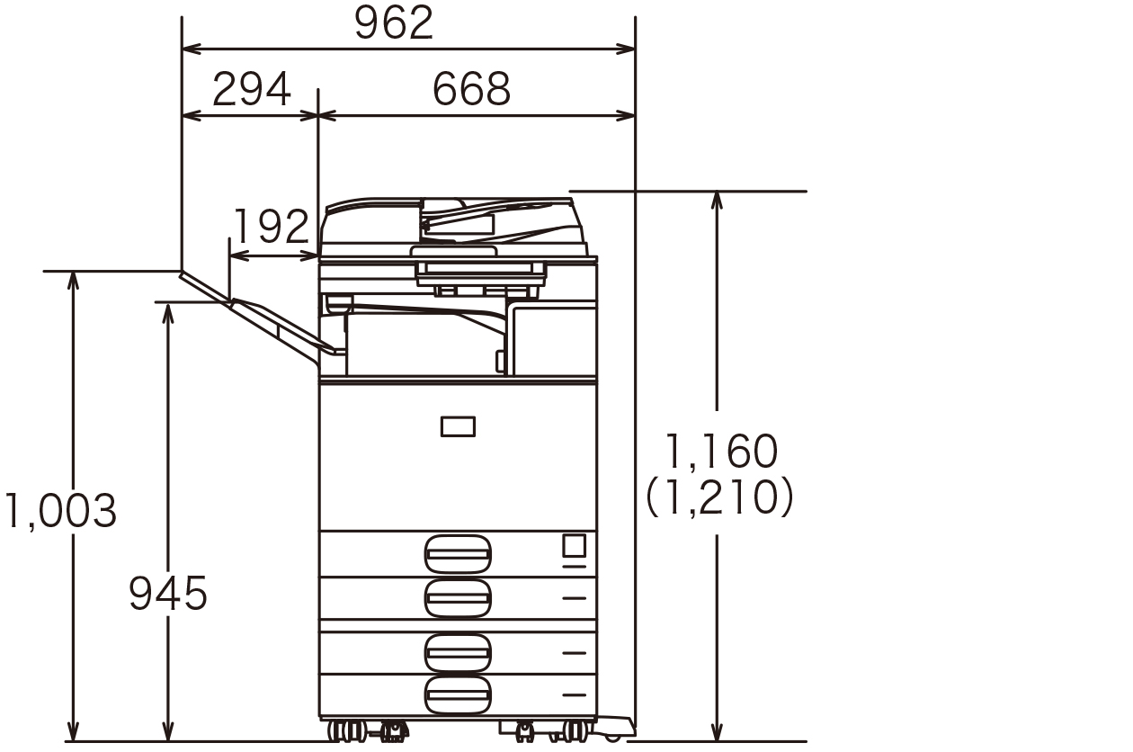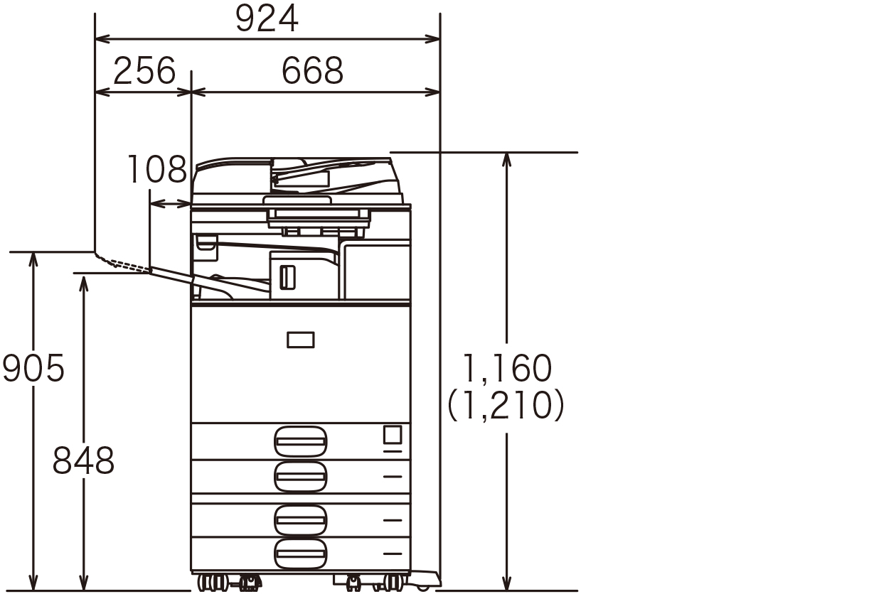 手差しトレイ開放、手差し延長トレイ開放、本体排紙受け開放時。奥行きは操作部を床に水平な状態から90度回転させた場合。