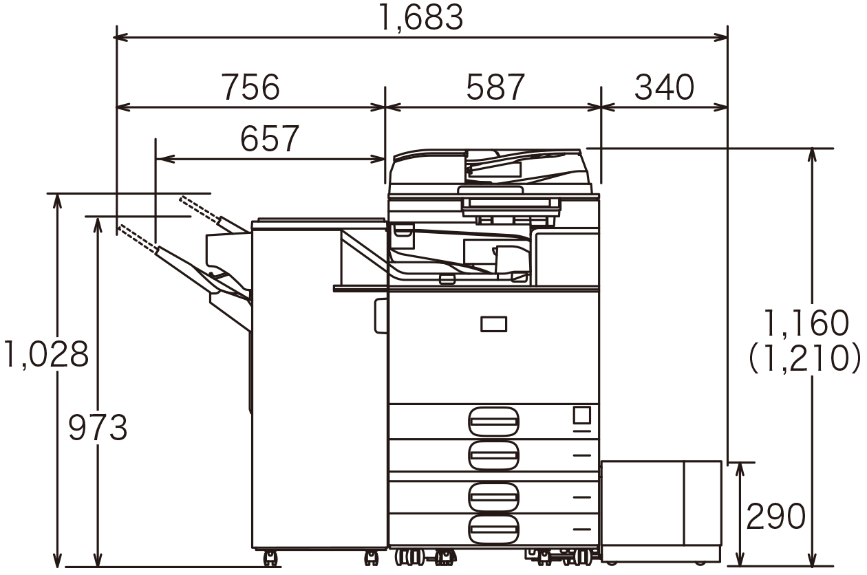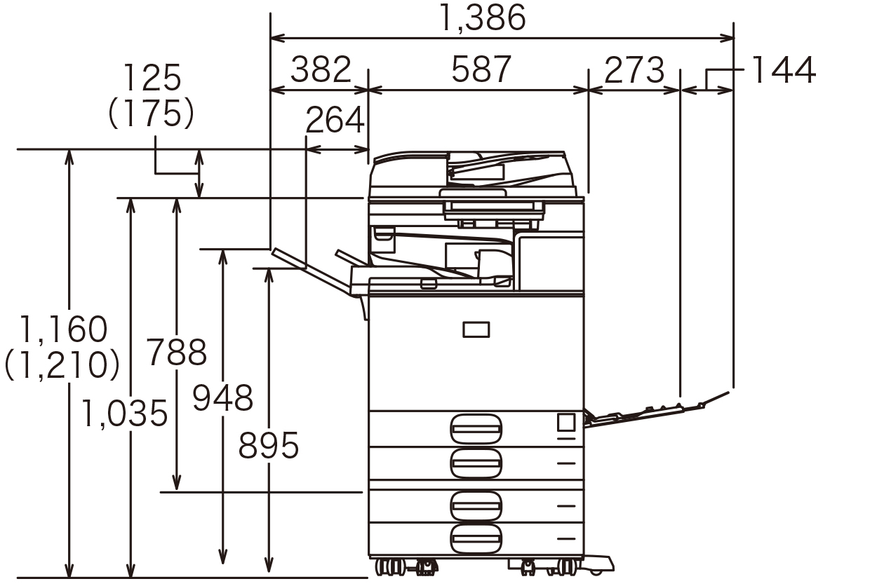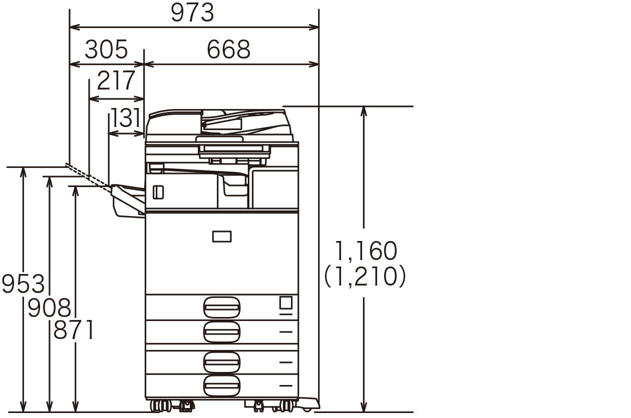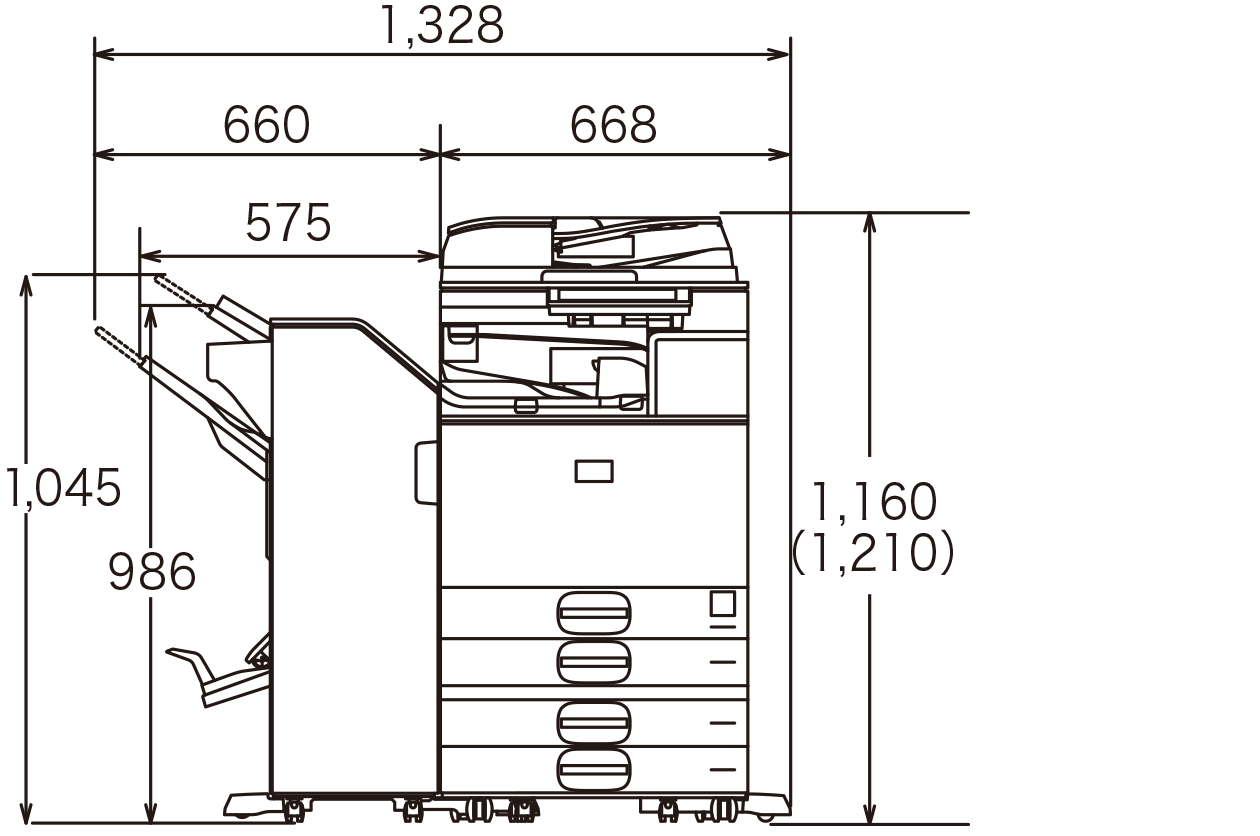 手差しトレイ開放、手差し延長トレイ開放、本体排紙受け開放時。奥行きは操作部を床に水平な状態から90度回転させた場合。