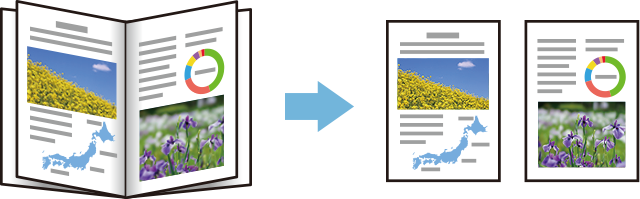 見開きの左ページと右ページを、それぞれ1枚の用紙にコピーできます。
