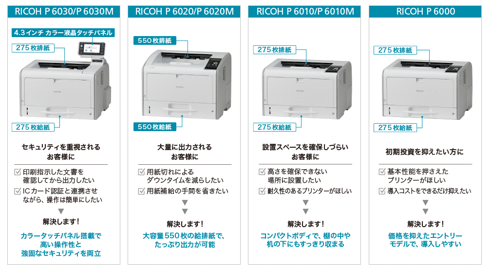 | 商品名 | RICOH P 6030 | RICOH P 6020 | RICOH P 6010 | RICOH P 6000 |
