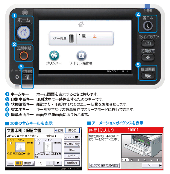 漢字やイラストで多彩な情報を表示できる4 行LCDパネルを搭載。待機時にはトナーの残量を常に表示するため、いざという時のトナー切れに備えることができます。