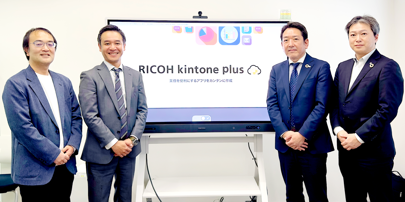 サイボウズ株式会社の『kintone』は、ノーコードで業務アプリを作成できるクラウドプラットフォームです。そのOEM版である『RICOH kintone plus』は、kintoneにリコーが一部機能を追加した製品です。本記事では、リコージャパンが協業を推進するDXエコシステム構想の先駆けとなった『RICOH kintoneplus』開発のキーパーソンであるサイボウズ株式会社の谷口修平様と、展開を担当する石井優様、そしてリコージャパンの中嶋祐、藤澤順一に、開発の経緯や展開状況を伺いました。