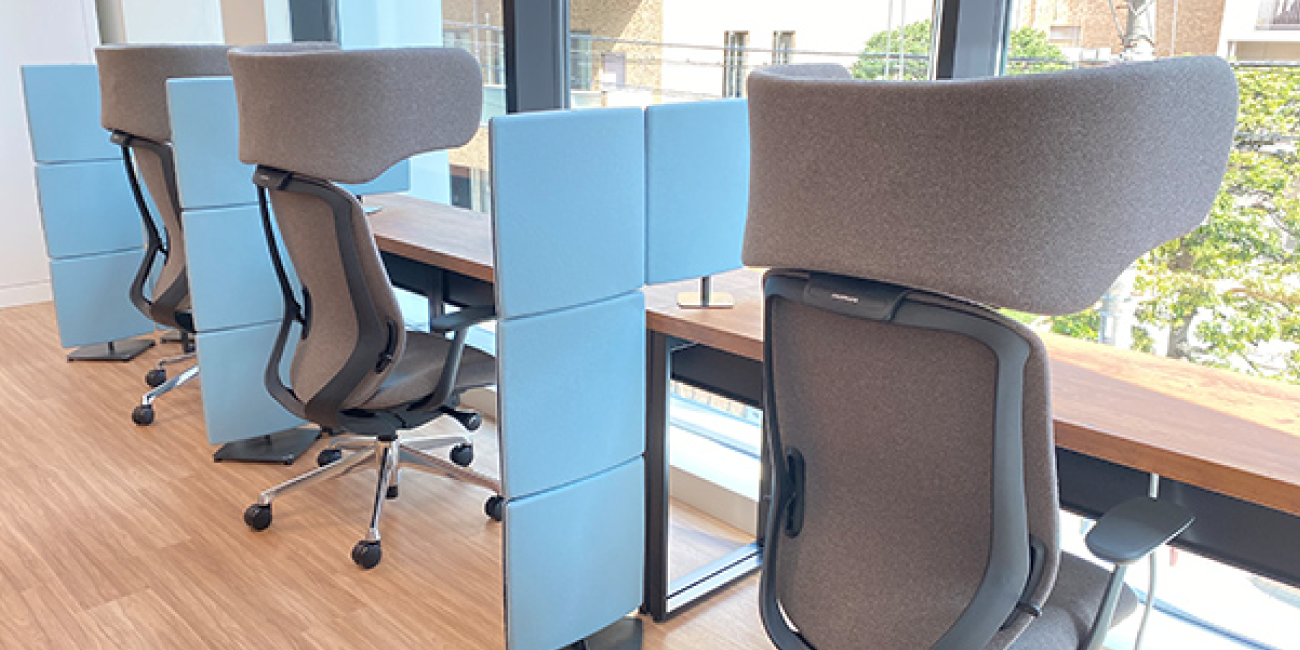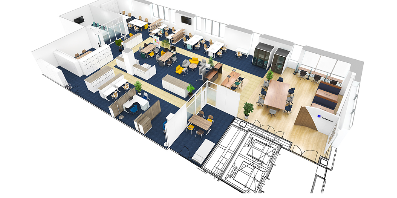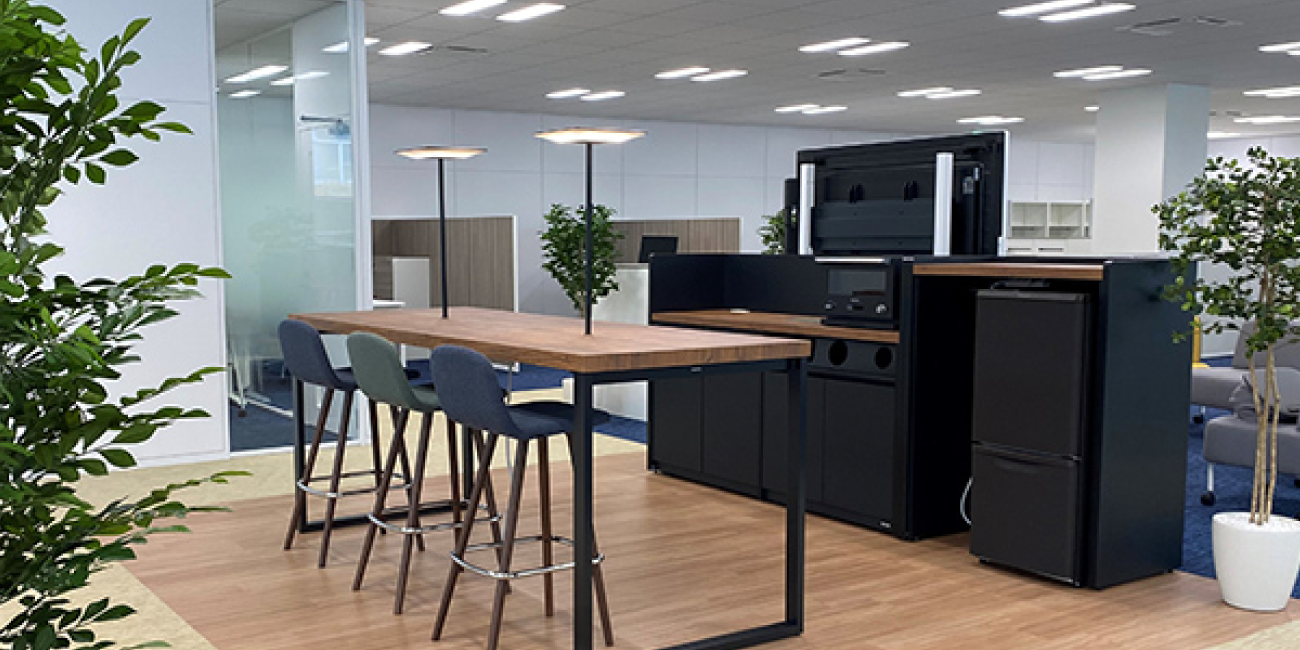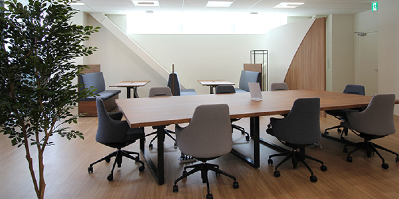明電興産株式会社様は新社屋竣工を機に、オフィスのあり方を改めて定義し、職場環境を刷新されました。オフィス中央にコミュニケーションエリアを設け、その周囲にカウンター席、集中ブース、ビッグテーブルなどのさまざまなタイプのワークスペースを配置。働く場所を自由に選べるワークスタイルと、明るく開放的な空間が社員同士の交流を促進し、業務効率も向上しています。さらに「魅せるオフィス」として、グループ会社にも自社の取り組みを積極的に紹介し、グループ全体の働き方改革促進にも寄与されています。