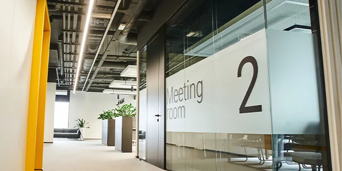 ミーティングスペースへ来客者をすぐに迎え入れたい場合もあるでしょう。そんなシーンに対応するためには、ミーティングスペースをエントランスから近い場所に用意することが一案です。社外とのコラボレーションを促進します。