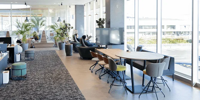 執務エリアとの境界が薄いという課題に対しては、あらかじめ計画的に動線を設計することが重要です。カフェスペースはできるだけアクセスしやすく、執務エリアから近い場所にあったほうが利用されやすくなりますが、近すぎるとカフェスペースのリフレッシュという目的が達成されない懸念もあります。