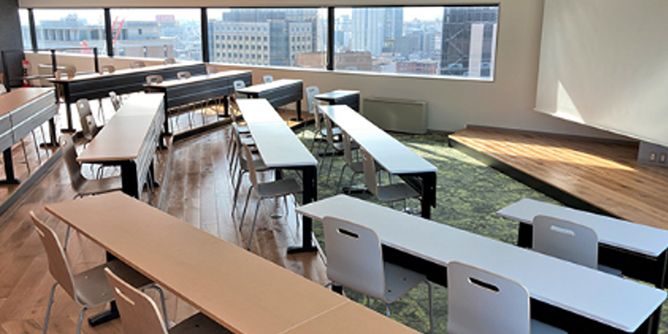 床をグリーンにし眼下に望む山下公園との一体感を演出したオープンな会議室。経営会議や会社説明会などに活用