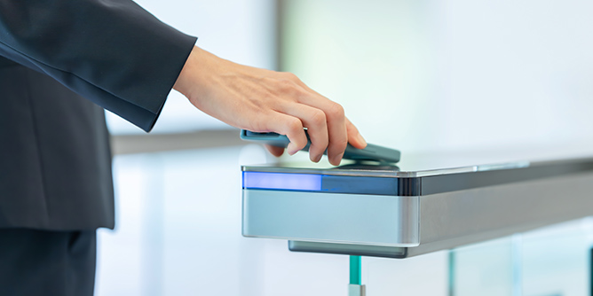 セキュリティゲートとは、IDカード認証や生体認証などの認証技術によって、認証した人物のみ通行を許可するゲートです。建物や施設の入退室口に設置されます。オフィスのエントランスの前段階の認証で、ビルに備わることが多くあります。