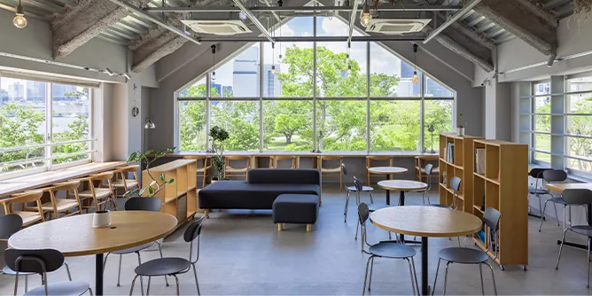 ある企業は、カフェカウンターを執務エリアの中心に設置しており、緑も設置するなどしてリラックスした状態で業務が行えるスペースを設けています。ミーティングを行うことも可能で、スタンディングミーティングのほか、ハイチェアに座りながらのスタイルも可能です。
