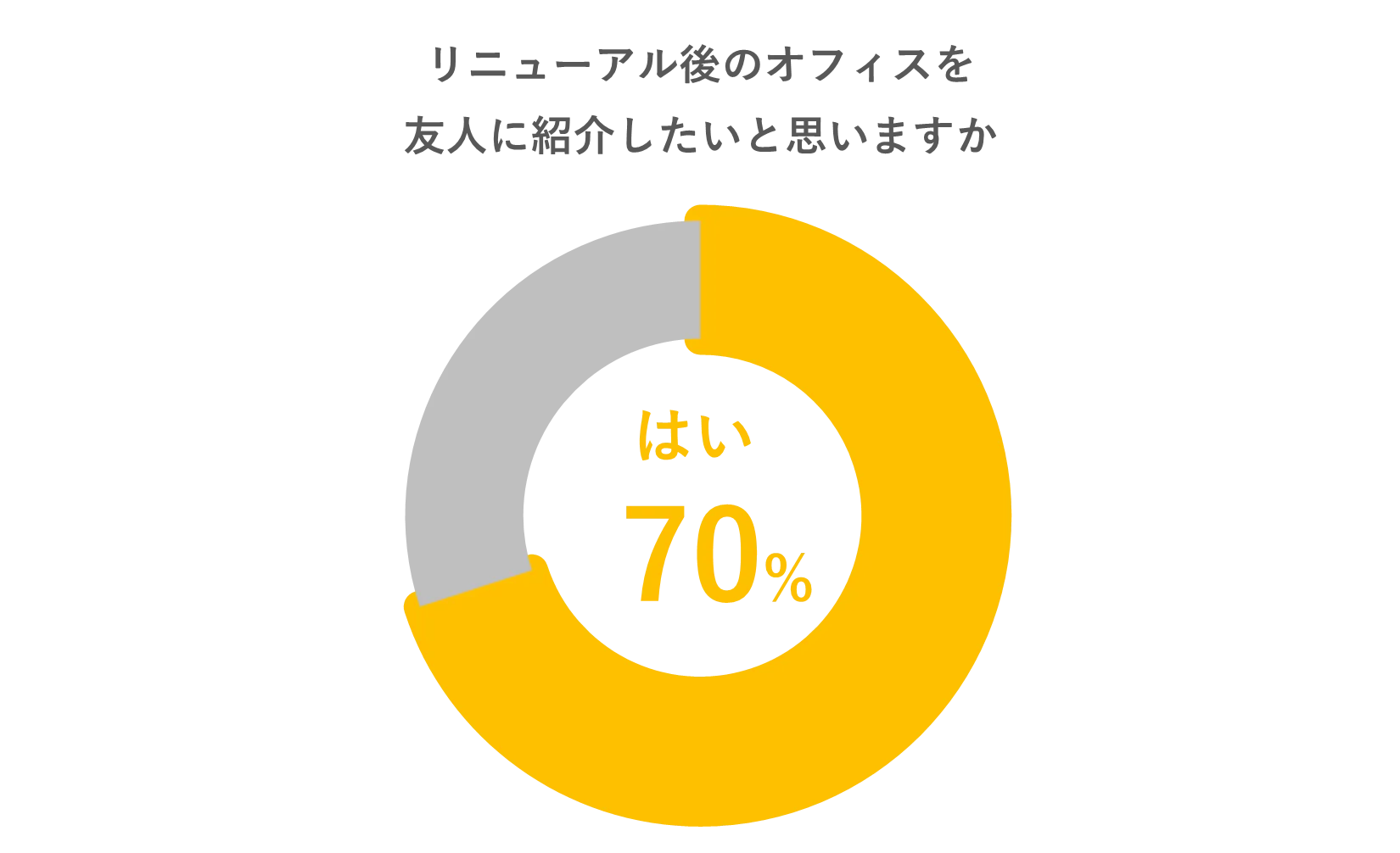 またリニューアル後のオフィスを友人へ紹介したいと考える社員は全体の70%となり、会社への誇りや一体感等の帰属意識向上も実現しています。