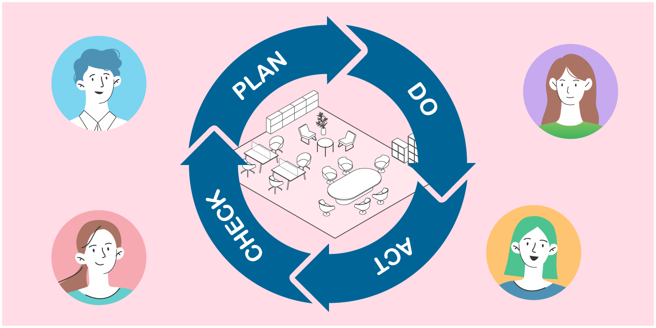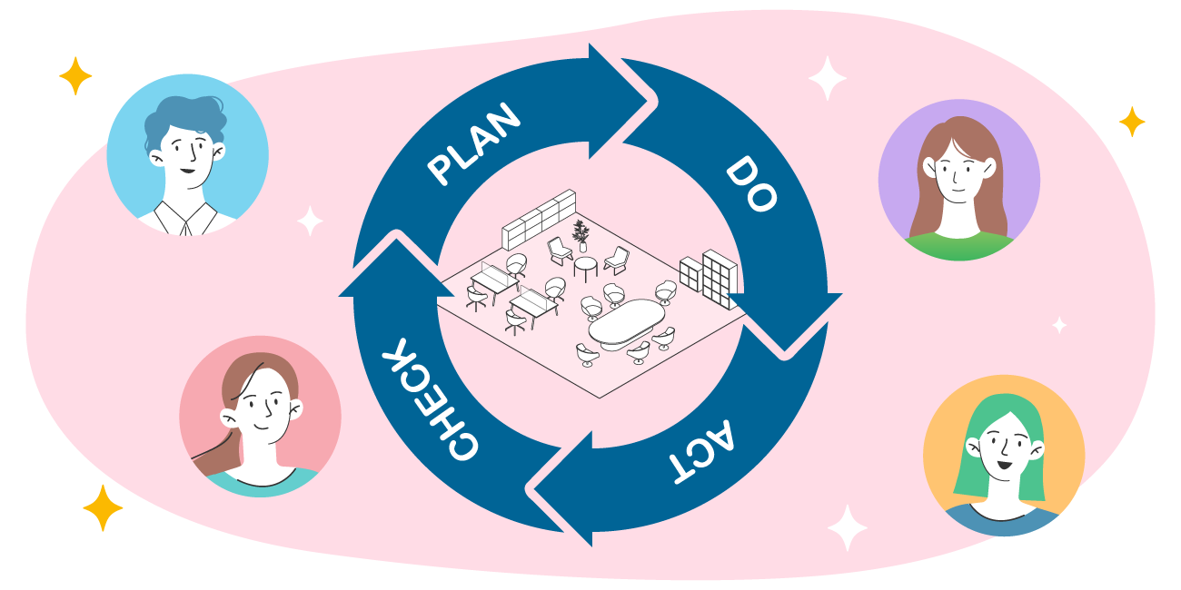 オフィス空間の有効活用のため、各種の空間データの収集で的確な分析と改善が可能になります。空間運用のPDCAの実施で、ビジネス環境の変化に柔軟な対応ができるようにオフィス空間を効率的にアップデートできます。