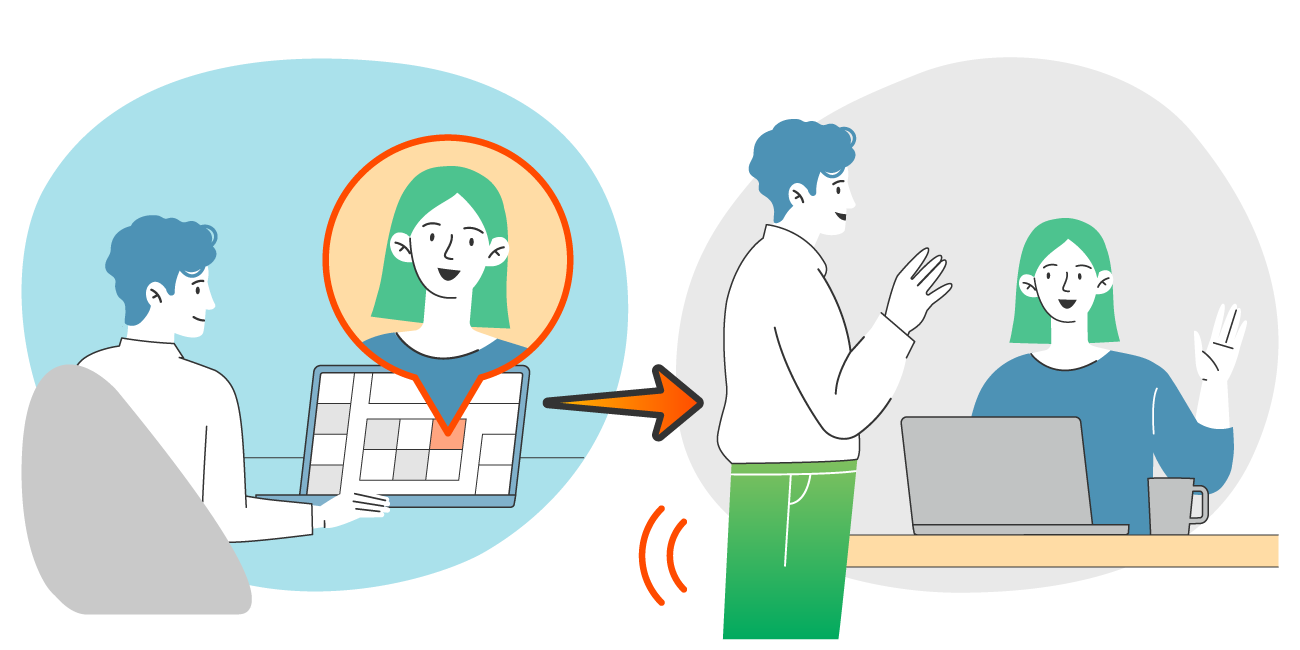 社内手続きがわからずに担当者のDさんを探したいBさん。座席システムを確認すると、Dさんが社内にいることがわかり、すぐに解決しました。