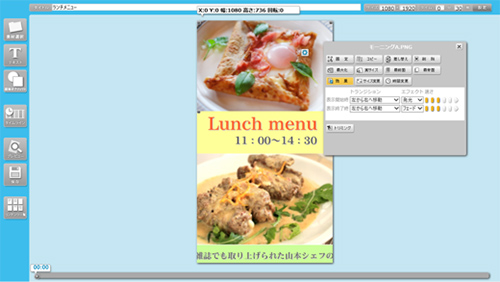 デジタルサイネージのコンテンツ制作をクラウド上で行えるものには大きく分けて2つあります。1つ目は、専用のコンテンツ制作サービスを使用する場合です。例えば、多数のテンプレートから適したものを選び、画像やテキストを登録するだけで簡単にコンテンツが完成します。2つ目は、デジタルサイネージサービスに含まれるコンテンツ制作機能です。キャンバスに静止画や動画、テキストなどを貼り付け、動きを付けて簡単に作成ができます。操作はWebブラウザ上でコンテンツ作成から配信設定まで可能なサービスもあり、利便性に長けています。