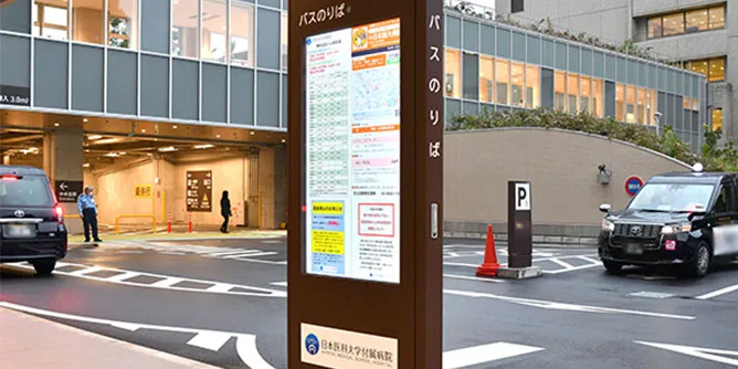 日本医科大学付属病院では、新病院のロータリーにデジタルサイネージを設置し、巡回バスの情報や病院からのお知らせ、防災情報を配信しています。3種類のバス情報を集約し、遠隔からの情報更新やWebコンテンツの自動更新を活用して、職員や地域への負担を軽減。ディスプレイを3分割することで、多様な情報を柔軟に提供し、来院者の利便性向上とともに災害拠点病院としての機能強化を実現しています。