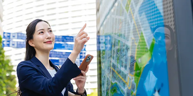 タッチパネル型デジタルサイネージとは、ディスプレイに情報を表示するだけでなく、画面をタッチして選択することで、ユーザーが自由に取得したい情報にアクセスできるものです。