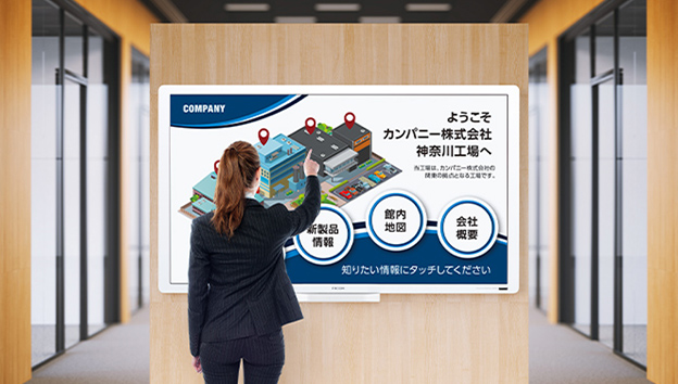 受付エリアにデジタルサイネージを設置し、訪問者の名前や会社名を表示することで、来訪者に対する歓迎の意を示します。また、訪問者向けの案内情報やオフィスのフロアマップ、企業の公式チャンネル案内なども表示できます。