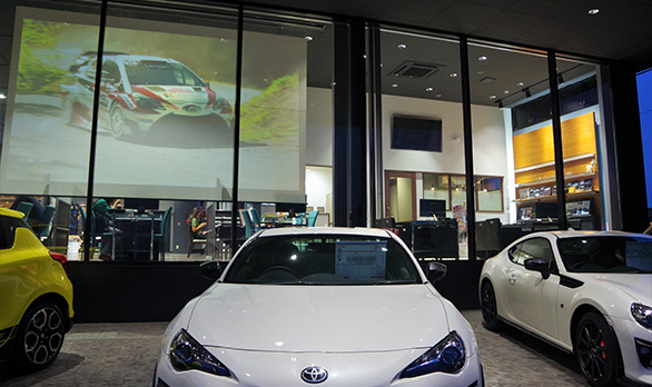 デジタルサイネージの導入により、店内のディスプレイに常に、モータースポーツやスポーツカーの映像・情報を映し出すことで、店舗の世界観を構築することができました。
