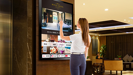 また、特にお問い合わせの多い内容については、タッチパネル式のディスプレイを活用し、画面にタッチして必要な情報にスムーズにアクセスいただけるようにしています。デジタルサイネージにより、心のこもったおもてなしを提供するとともに、リピーターにも満足いただける幅広い情報提供、多様な魅力発信を実現しています。