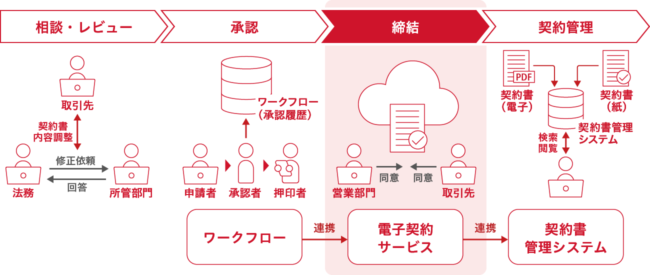 契約業務には、契約審査、締結、保管、契約管理といった一連のプロセスがあります。リコージャパンは契約締結の前後にある、これらの業務を連携させることにより、さらなる業務効率化や課題解決をご支援いたします。