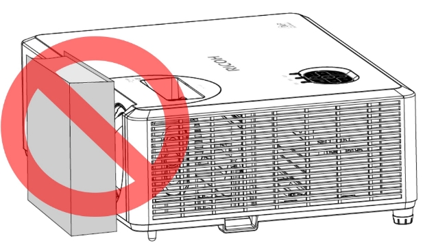 プロジェクターを投影中、レンズの直前に本などの遮光物を置いて映像を隠すことは絶対にしないでください。