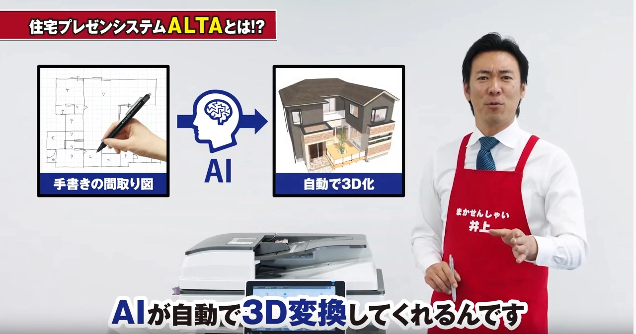 リコー製複合機とコンピュータシステム研究所“ALTA AIスケッチ”との連携により、手書き図面をAIで3Dデータに自動変換し、より早く・正確な3Dパースの作成を実現。施主様への提案力を向上します。