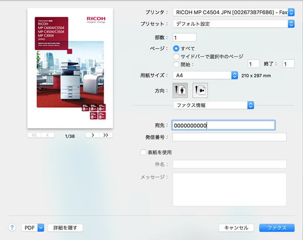 [あて先]にファクス番号を入力し、印刷設定をして、[ファクス]をクリックします。