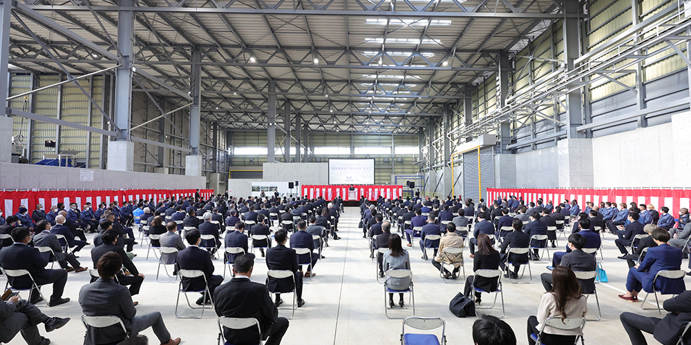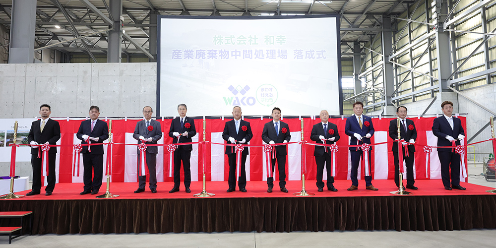 国内最大級の中間処理場の落成式では、稼働前の中間処理場内を会場に、全社員と取引先をお招きし、日頃の感謝と落成の喜びを共有しまし た。式典ではプロモーションムービーも放映。式典後は社員様による場内案内ツアーと昼食会を開催。これからの未来を共に作るパートナーとの絆を深めました。