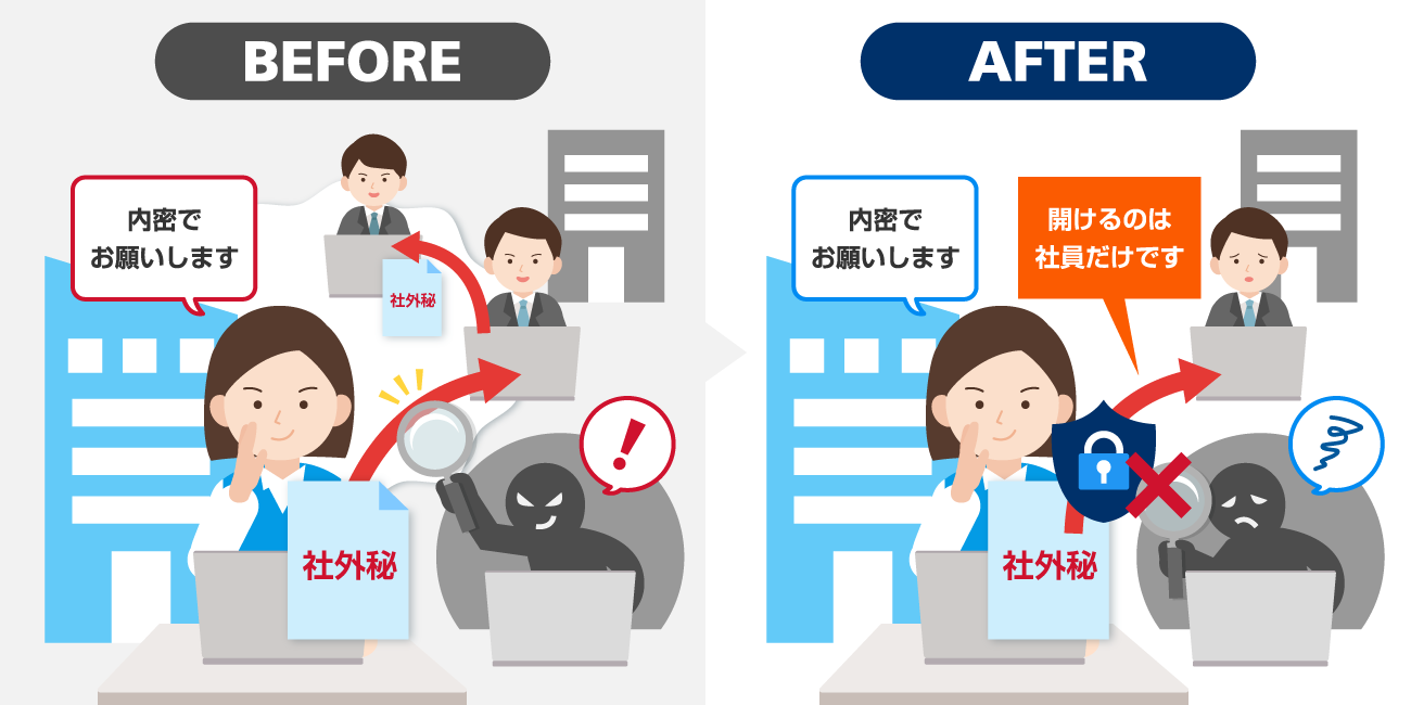 このため、秘密度ラベルが設定されていれば、仮にファイルが社外の第三者の手に渡ったとしても、そのファイルを開くことができない仕組みになっています。
