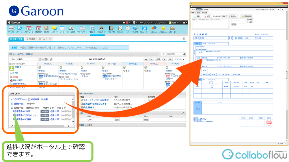 連携によって、ガルーンのポータル画⾯にコラボフローの承認状況・書類検索・書類作成をポートレットとして表⽰できるなど、申請承認業務の迅速化・効率化が図れるようになります。