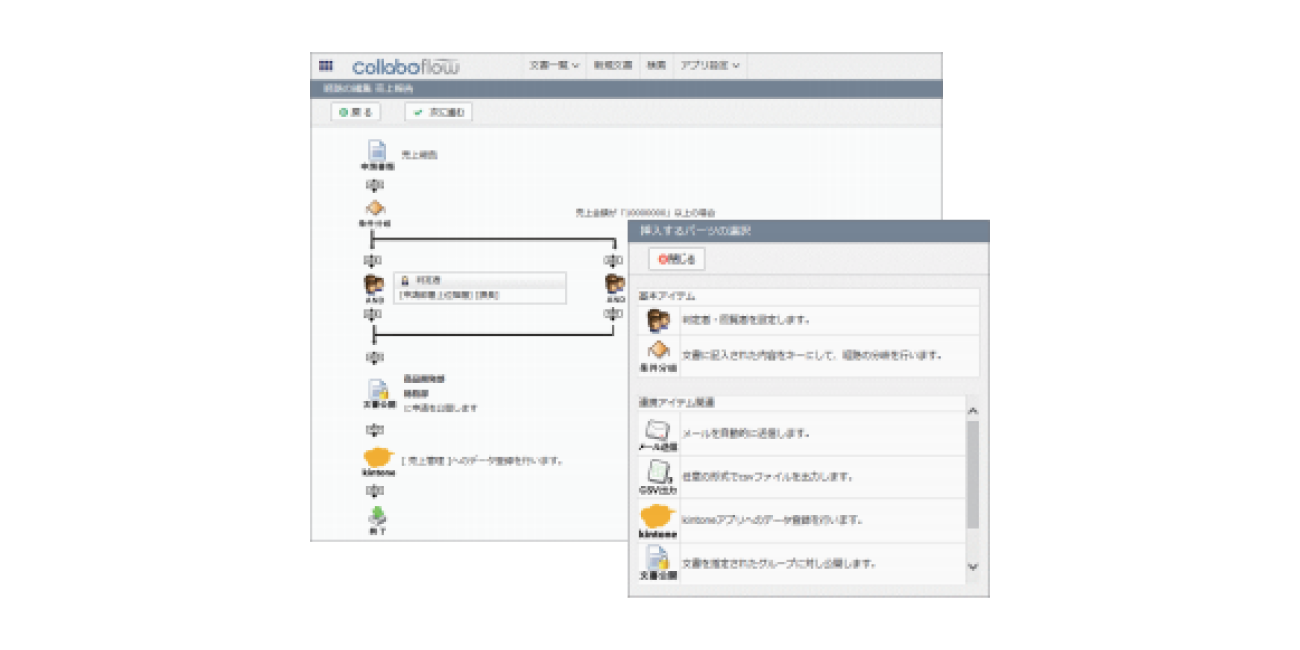 コラボフローはパーツを配置するだけのシンプルな経路設定。起案部署から上長を自動判断するので、1つ経路で全部署をカバー。