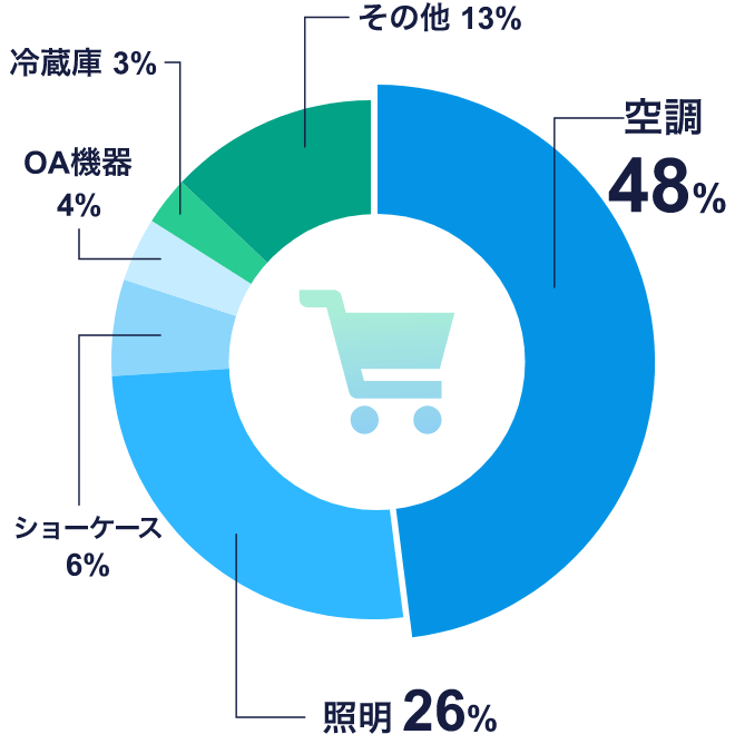 空調48%、照明26%、その他13%、ショーケース6%、OA機器4%、冷蔵庫3%