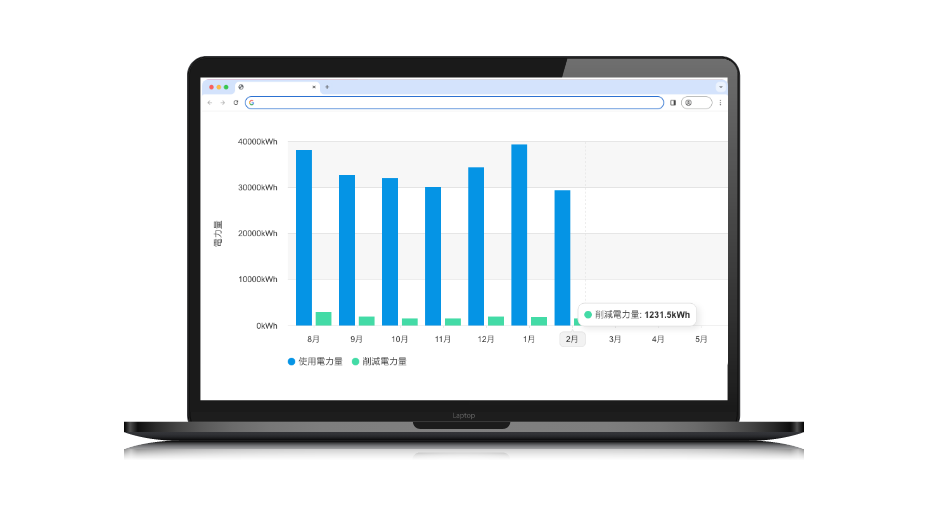 測定情報はクラウドに上がり、ご自身のPCから状況確認と設定変更ができます。クラウドでは主に、建屋全体の電気使用量、制御によって削減した電力量が確認できます。