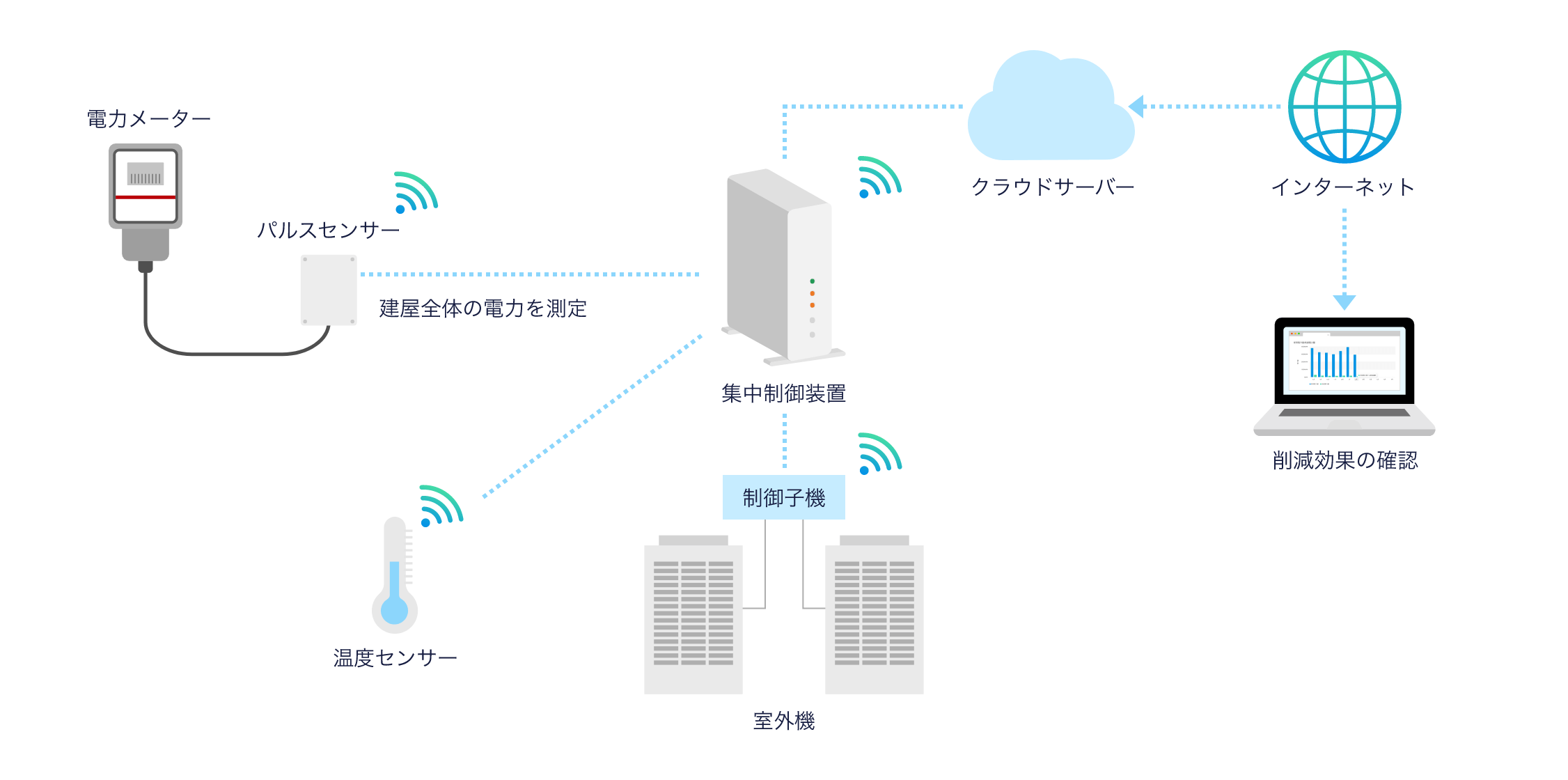 建屋の瞬時電力(デマンド値)と温湿度情報を元に、集中制御装置から空調室外機に取り付けられた制御子機に指令を出し、空調の運転を制御することで、電気使用量を削減します。