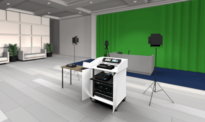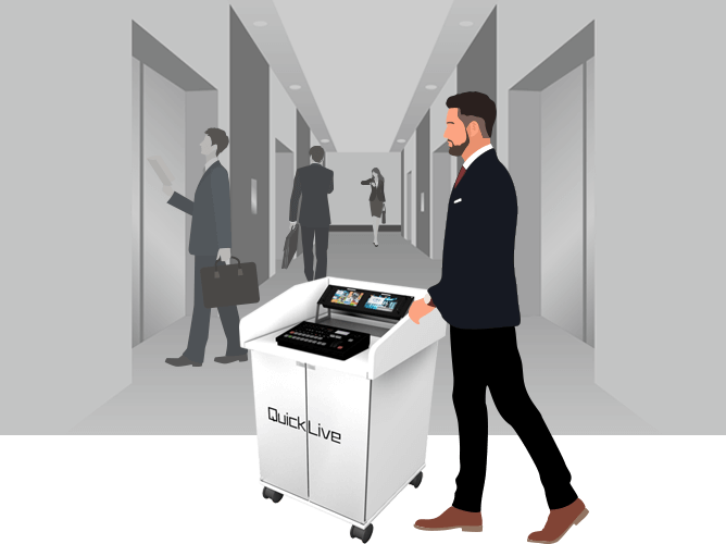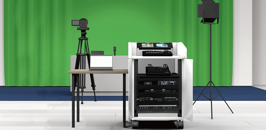 キャスター付きのワゴンに配信機材を集約し、様々な場所から配信を開始することができます。