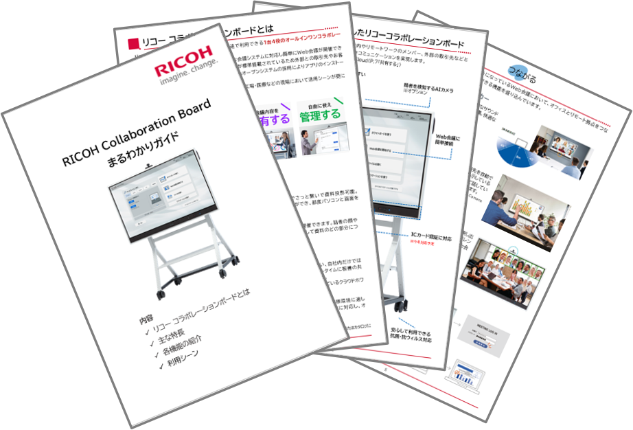 | RICOH Collaboration Board Cloud | RICOH Collaboration Boardに標準で搭載されているクラウドホワイトボードです。 社内のみならず、外部の取引先やお客様ともリアルタイムに板書を共有、双方向での手書きコミュニケーションを実現することが可能となります。 品種コード:801218 |