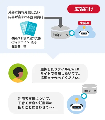 庁内データを管理画面にアップロードするだけで準備完了!登録したデータに基づき生成AIで回答します。データ準備の作業など不要で、アップロードした庁内データにもとづき利用者の質問に対する回答を生成します。