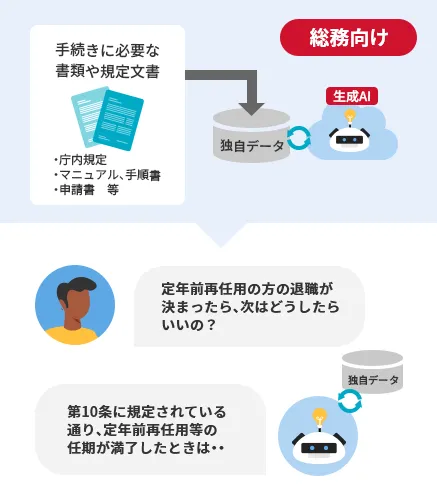 庁内規定について知りたいとき、施策や制度の通知文書を探したいとき、過去の報告書を参考にしたいとき、チャットで質問をすると庁内データを基に回答を自動生成します。