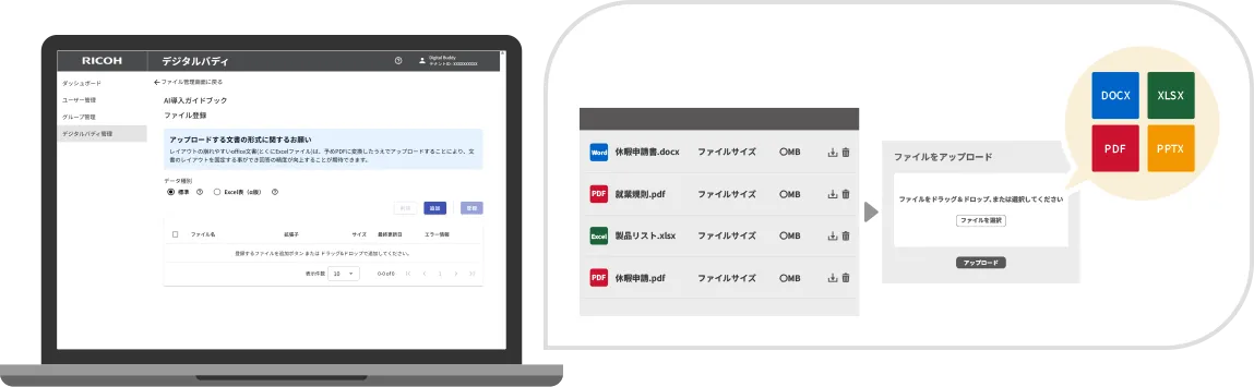 RICOH デジタルバディ for 自治体は、庁内データを登録するだけで、自治体独自の生成AI環境を構築することができます。