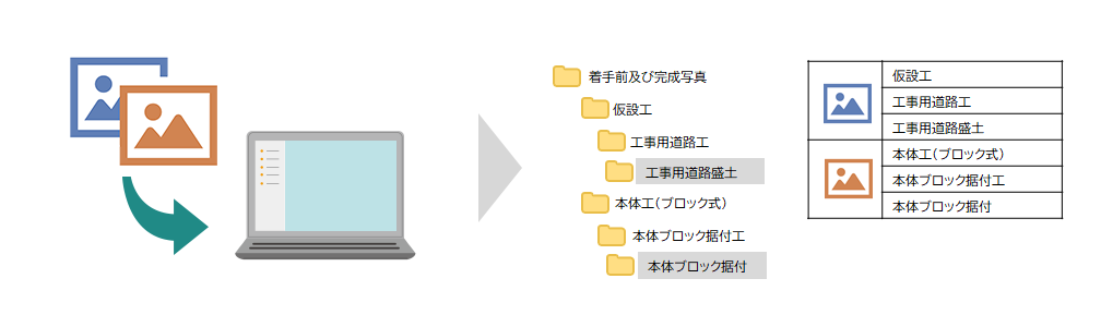 電子小黒板写真は小黒板情報連携機能に対応している電子納品ソフトに取り込むと自動で最適なフォルダに仕分けられ、さらに工事情報も自動で入力されます。