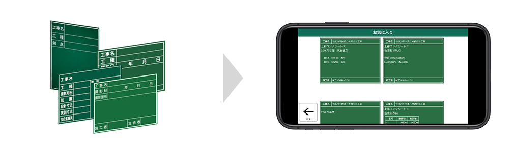 従来の黒板とは違って黒板を持ち運ぶ必要はなく、スマートフォンひとつで様々な写真区分の撮影が可能となります。また撮影した写真には様々な工事情報(工事名や工種。種別・細別など)が記録されており、大量の写真の整理もカンタンにおこなうことができます。国土交通省直轄工事(一般土木)、営繕工事において、現場撮影の省力化や写真整理・写真帳管理の効率化及び信頼性の確保を図るため、デジタル工事写真の小黒板情報電子化の運用を平成29年4月から開始しました。電子小黒板の導入によって現場の省力化・効率化が図られます。
