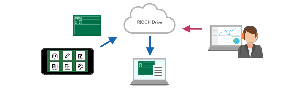 現場事務所のNASやPCに写真を保存していた場合、万が一の機器の故障や災害などで大事な写真が、最悪無くなってしまうリスクがあります。RICOH Driveでは撮影写真はリコーのクラウドストレージRICOH Driveに保存されます。24時間365日の運用監視体制のもと、信頼性の高いAWS™に写真が保存されるため安心して写真を保管できます。
