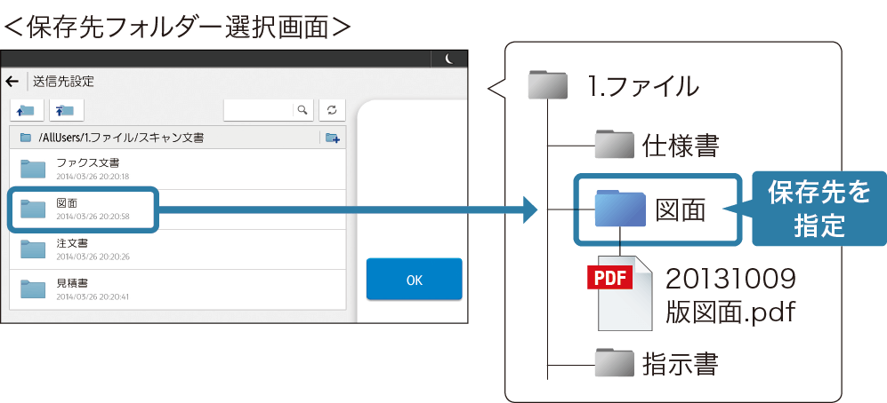 紙文書を電子化する際、複合機の操作部から、保存先フォルダーやファイル名を指定できます。