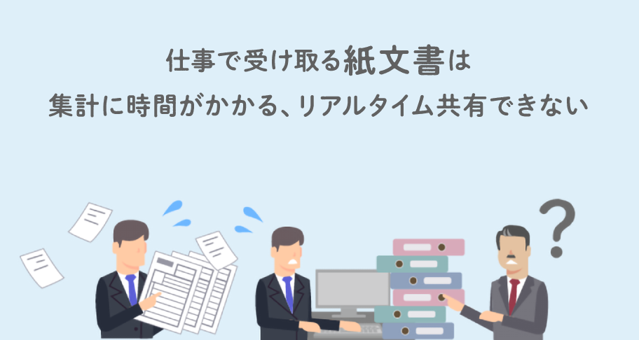 取引先から送られてきた注文書のファクスを各担当者に配布するため、配布漏れや確認の遅れが発生する場合があります。また、各担当者はデスクで紙の注文書を見ながら受注状況を手入力する必要があり、受注状況の共有が遅れてしまうこともあります。