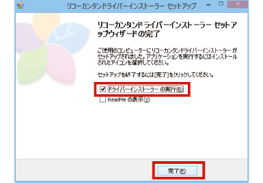 リコーカンタンドライバーインストーラーのインストールが完了しました。続けて、ドライバーのインストールを実行する場合には、[ドライバーインストーラーの実行]にチェックを入れて、[完了]をクリックします。